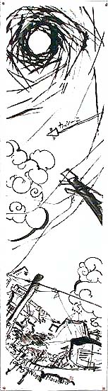 この絵は僕の家の窓からの景色です、水墨画の風景は植物を描くのが普通だけど、建物や電柱など人工的なものを水墨画として不自然じゃないように描こうと思って作りました。