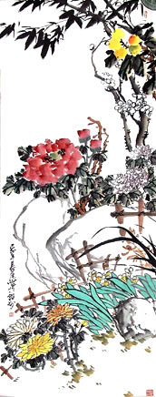 いつでも掛けれるように 四季の花いろいろ描き込みました。 人に頼まれて初めての試みだったけど なんか自分でもうまくできたと思えて嬉しかったです。 描く物の種類を沢山描けば描くほど お互いの主張の仕方をバランスよく 配置するのが気を使うとこです、この絵はボタンを主役にしました。
